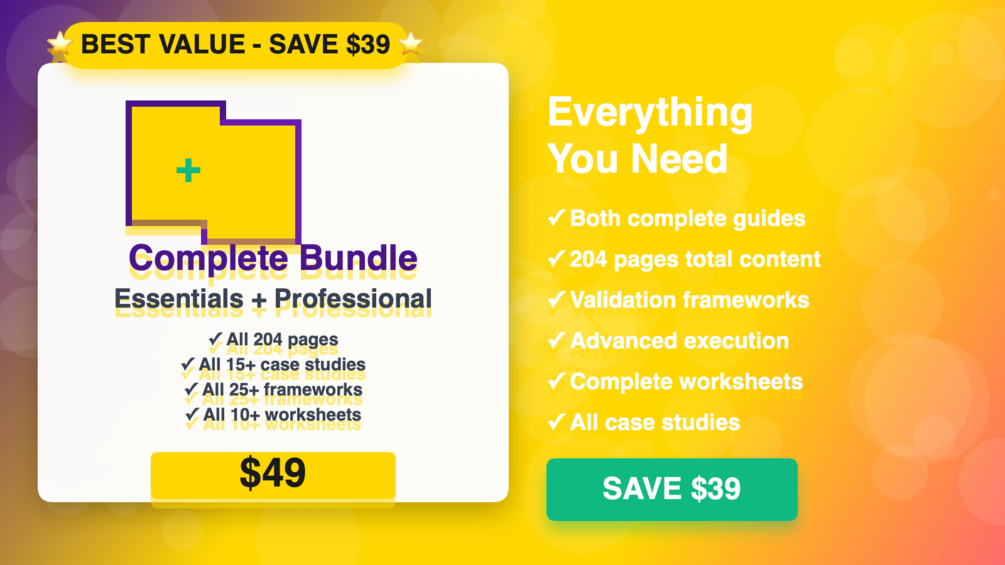 Even if you're just exploring, the bundle gives you room to grow. Start with the Essentials frameworks, then level up to Professional execution strategies when you're ready - all for less than the Pro guide alone.
